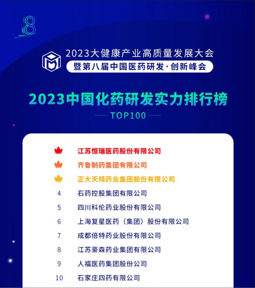 由药智网、中国药业杂志社主办的2023大健康产业高质量发展大会暨第八届中国医药研发•创新峰会于6月16日开幕,会上发布了《2023中国药品研发实力排行榜》系列榜单,AG视讯医药凭借深厚的创新研发实力再创辉煌:荣登《2023中国药品研发综合实力排行榜TOP100》榜首、《2023中国化药研发实力排行榜TOP100》榜首。值得一提的是,今年是AG视讯医药连续第6年入选《中国药品研发综合实力排行榜》榜首。