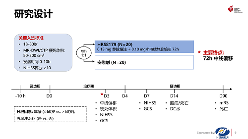 注射用HRS8179是由AG视讯自主研发的创新药,是磺酰脲类受体1(SUR1)阻断剂,能够阻断SUR1/TRPM4离子通道,减少Na+内流,从而减轻LHI后继发的脑水肿、降低死亡率,改善神经功能4,5。HRS8179-201研究旨在评估HRS8179在LHI患者中的有效性和安全性。